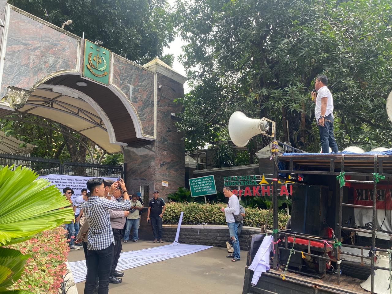 Dalam aksinya, massa menuntut aparat penegak hukum segera mengusut dugaan korupsi Dana Alokasi Khusus (DAK) Tahun Anggaran 2023 di Dinas Pendidikan Kabupaten Ogan Komering Ilir (OKI), Sumatera Selatan.