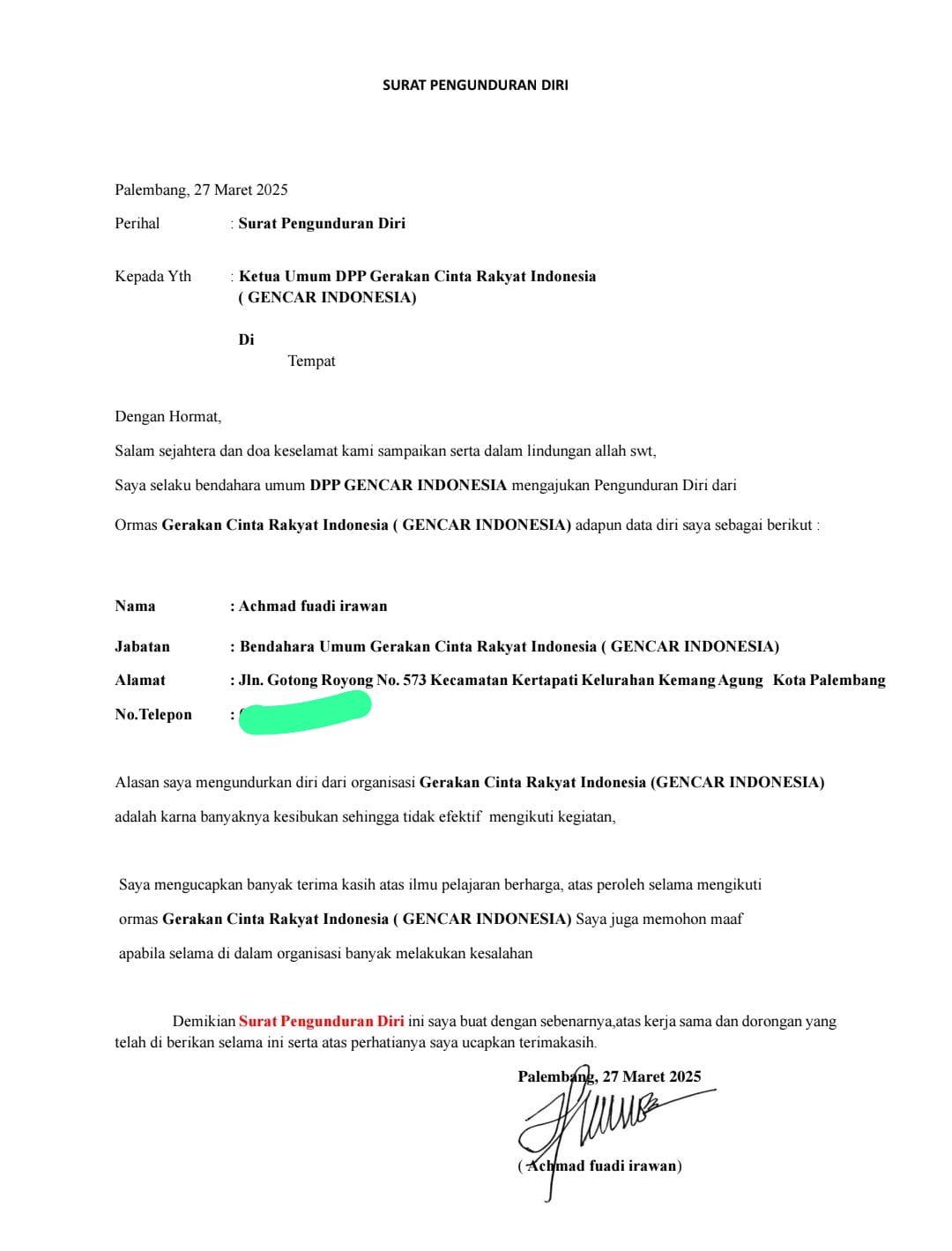 INDODAILY.CO, PALEMBANG — Bendahara Umum (Bendum) Dewan Pimpinan Pusat Gerakan Cinta Rakyat (DPP GENCAR) Indonesia, Achmad Fuadi Irawan yang akrab disapa Adi BGP, resmi mengundurkan diri dari kepengurusan organisasi.