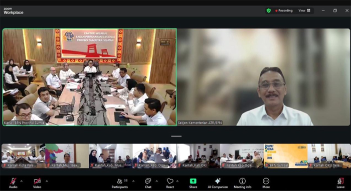 JAKARTA – Sekretaris Jenderal Kementerian Agraria dan Tata Ruang/Badan Pertanahan Nasional (ATR/BPN), Dalu Agung Darmawan, memberikan pengarahan dalam rapat kerja daerah (rakerda) Kantor Wilayah BPN Provinsi Sumatera Selatan (Sumsel) pada Kamis (5/3/2026).