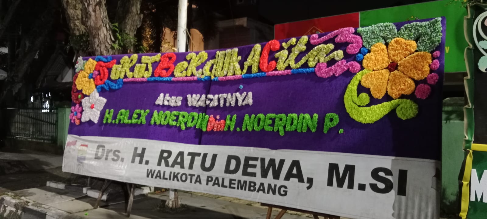 Karangan bunga berukuran besar itu tampak terpasang di depan rumah duka pada Rabu (25/2/2026). Dalam papan bunga tersebut tertulis ucapan “Turut Berduka Cita Atas Wafatnya H. Alex Noerdin Bin H. Noerdin Pandji” dengan nama pengirim Drs. H. Ratu Dewa, M.Si, Wali Kota Palembang.