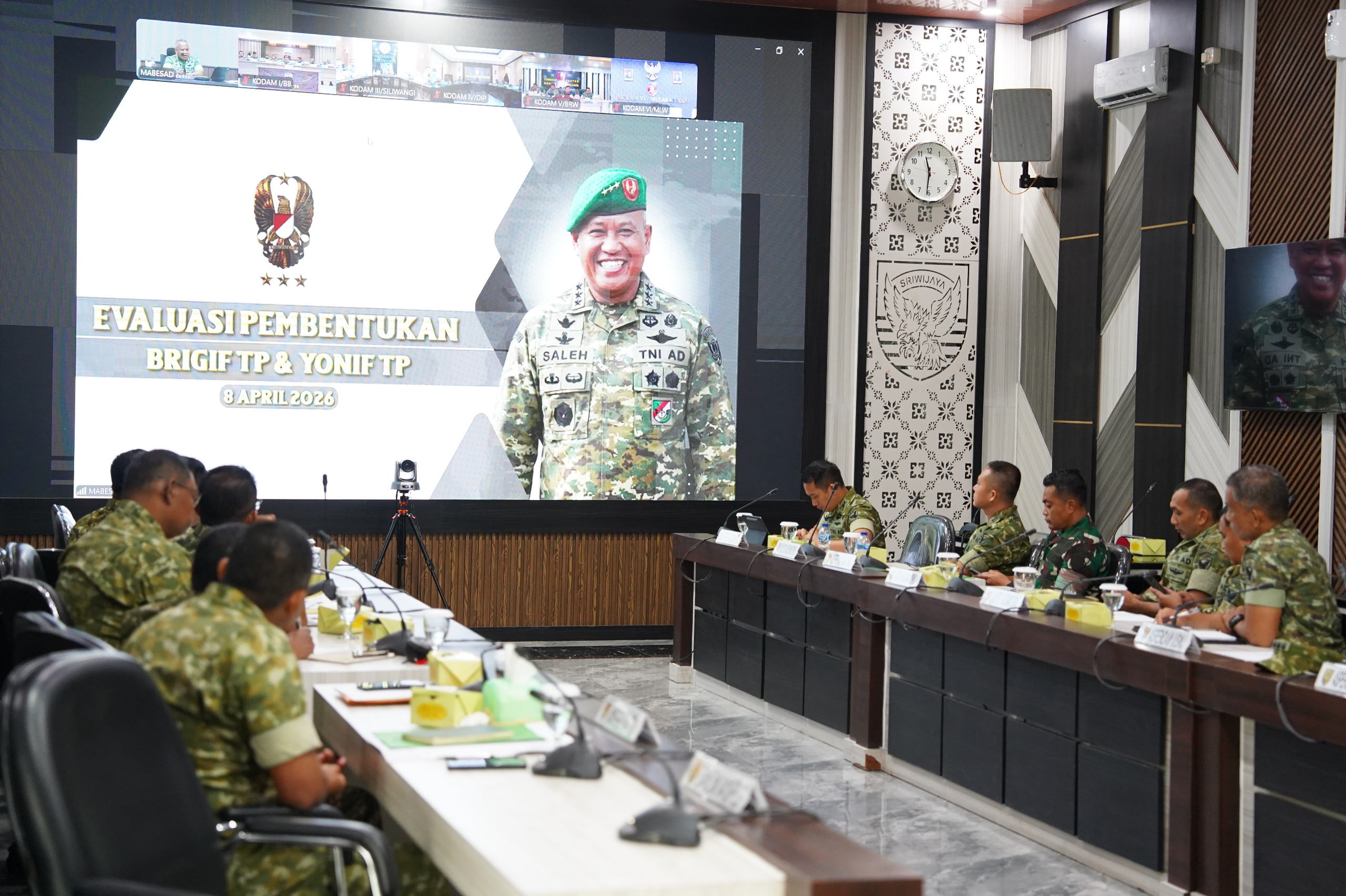 Brigjen TNI Iwan Ma'ruf Zainudin (Kasdam II/Swj), mengikuti kegiatan Rapat Koordinasi Anggaran (RKA) Evaluasi Tata Tuksat Brigif TP dan Yonif TP Jajaran TNI AD melalui video conference (vicon) bertempat di Ruang Puskodalopsdam II/Swj, Rabu (08/04/2026).