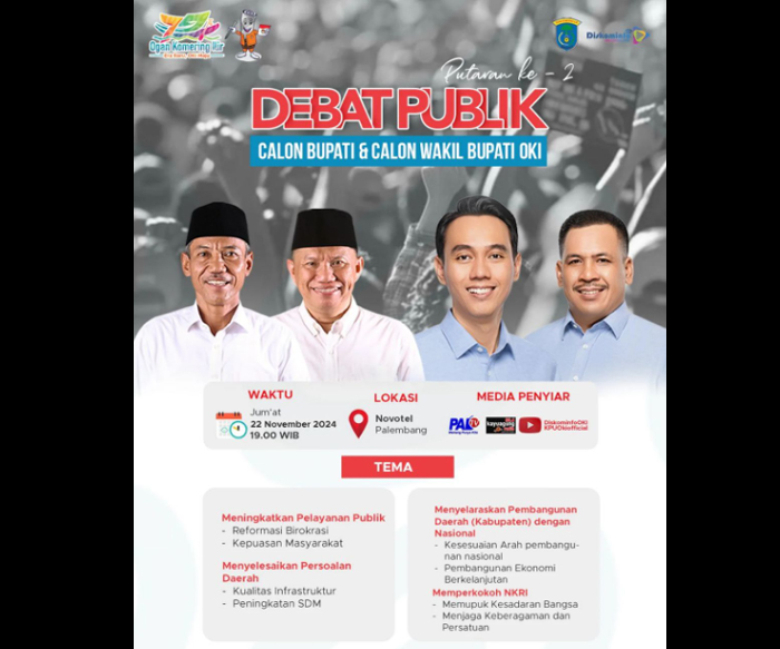 INDODAILY.CO, OKI – 6 hari menjelang pemilihan pada 27 November 2024 mendatang, Komisi Pemilihan Umum (KPU) Kabupaten Ogan Komering Ilir (OKI) kembali menggelar debat publik putaran kedua pada Jumat (22/11/2024) besok.