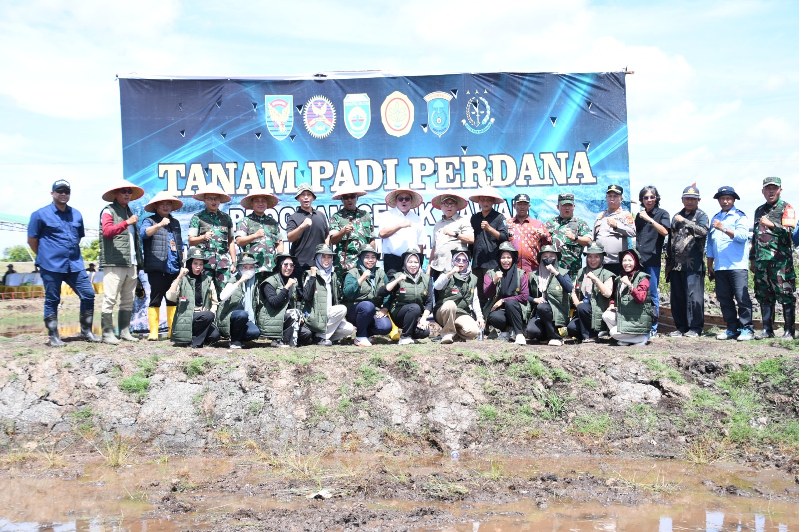Acara ini dihadiri oleh Direktur Jenderal Lahan dan Irigasi Pertanian serta Komandan Korem 044/Gapo Brigjen TNI Adri Koesdyanto, yang bersama-sama meninjau hasil pembangunan konstruksi cetak sawah sekaligus melaksanakan penanaman padi perdana, Jumat (21/11/2025).