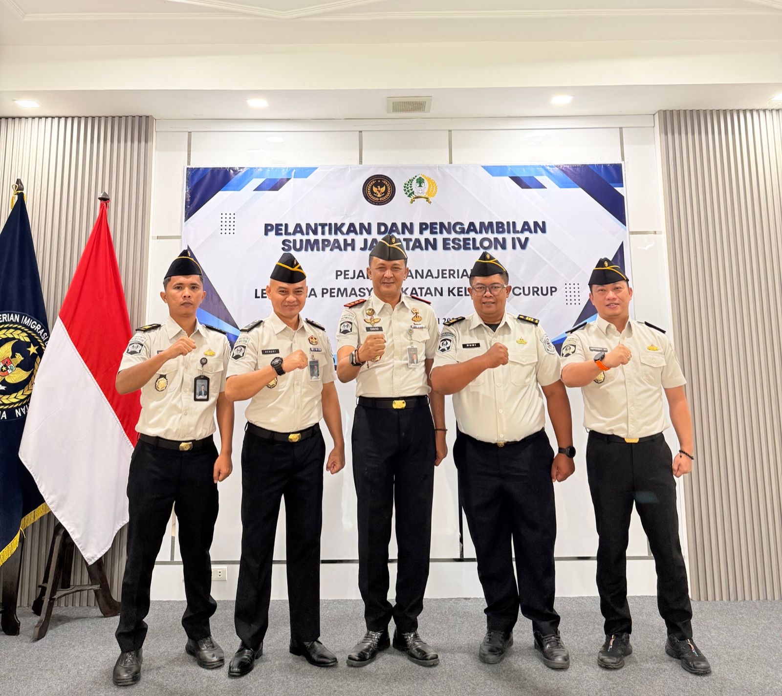 Adapun pejabat yang dilantik dalam kesempatan tersebut yakni Dudi Anggriyono, A.Md.IP. sebagai Kepala Kesatuan Pengamanan Lapas (Ka.KPLP), Hendry Gunawan, S.H. sebagai Kepala Seksi Kegiatan Kerja (Kasi Giatja), Pebbri Yantoni, S.H., M.H. sebagai Kepala Seksi Pembinaan Narapidana/Anak Didik (Kasi Binadik), serta Adi Muhardian Santoso, A.Md.P., S.H. sebagai Kepala Seksi Administrasi Keamanan dan Ketertiban (Kasi Adm Kamtib).