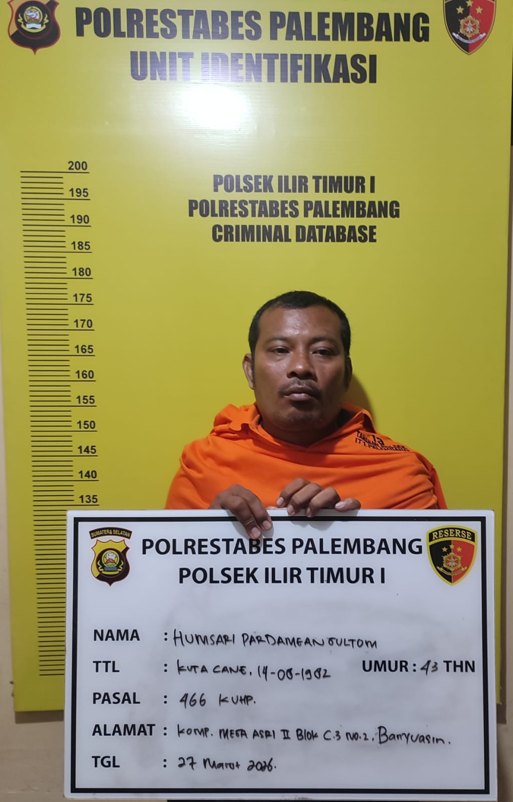 Tersangka berinisial HP (43), warga Kabupaten Banyuasin, diamankan sesaat setelah melakukan tindakan kekerasan terhadap korban F (41), seorang perempuan yang tengah mengendarai sepeda motor di lokasi kejadian.
