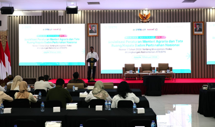 Peraturan tersebut menjadi fondasi tata kelola organisasi yang terintegrasi, sistematis, dan berkelanjutan. Untuk meningkatkan pemahaman jajaran, Kementerian ATR/BPN menggelar Webinar Sosialisasi Permen ATR/Kepala BPN 1/2026 tentang Manajemen Risiko secara daring dan luring di Aula Prona, Jakarta, Kamis (5/2/2026).